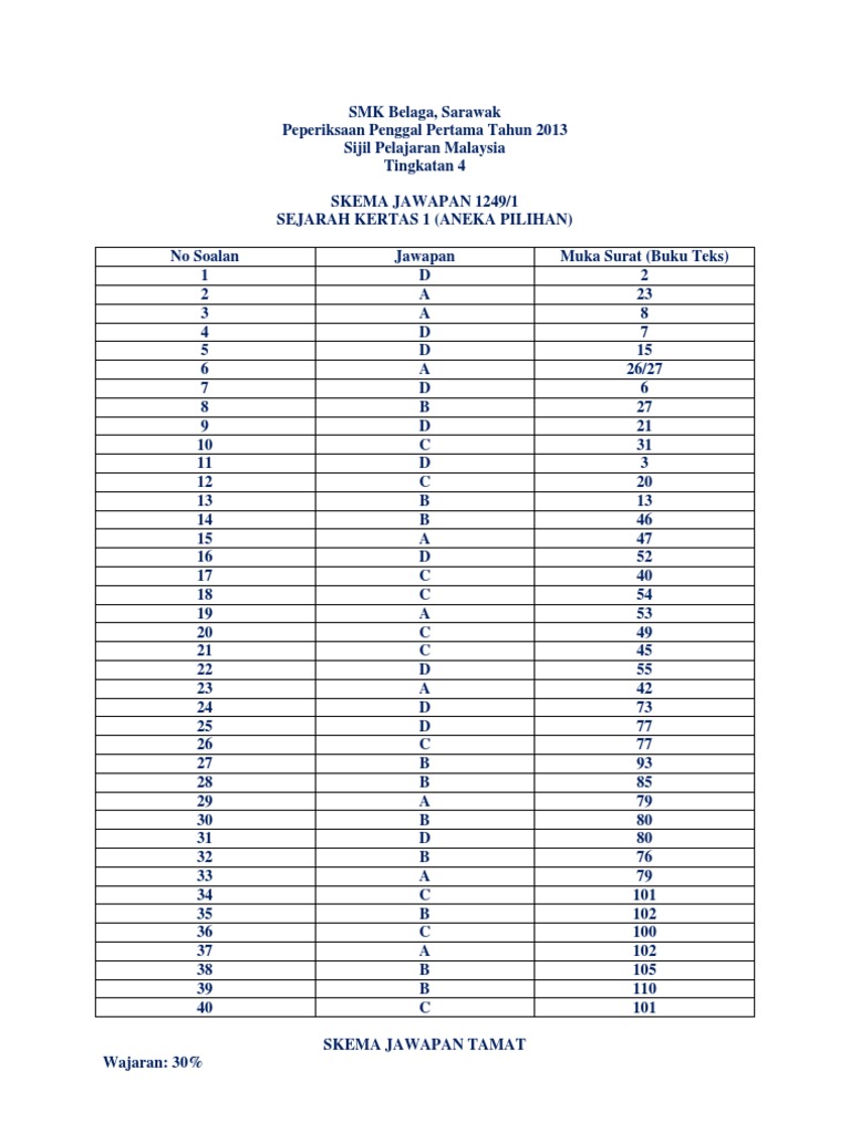 Skema Jawapan Kertas 1 Sejarah Tingkatan 4 Peperiksaan Penggal Pertama 2013 Pdf